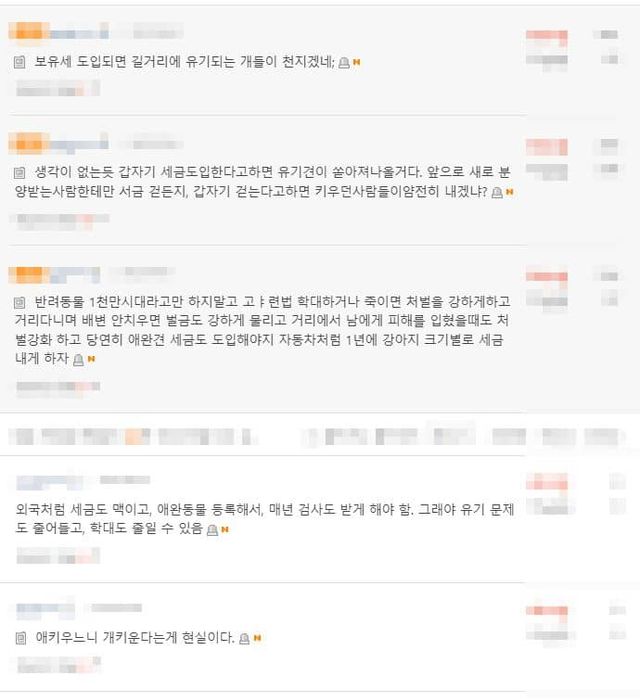 이 소식을 접한 네티즌들은 "생각 없이 세금도입하면 길거리에 유기견이 오히려 쏟아질 것이다", "좋은 제도인 것 같다. 외국처럼 세금도 부과시키고 내년 갱신해서 검사도 받게 해야 한다", "이렇게 되면 유기나 학대가 확실히 줄어들 듯", "애 키운다고 개 키우는 현실에 출산율 높아지기도 할 듯", "이래야 보유자들이 조금 더 신중해질 듯" 등 다양한 반응을 보이고 있지만, 긍정적인 반응이 주를 이루고 있다.