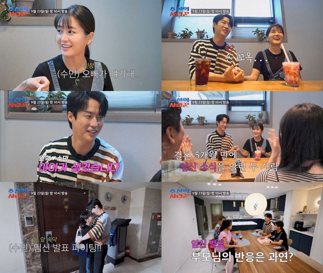 23일 ‘조선의 사랑꾼’ 제작진이 선공개한 영상에는 이른 아침부터 제작진을 소환한 이수민♥원혁 부부의 모습이 담겼다. 제작진은 “저희 부른 이유가 뭐예요?”라고 물었고, 원혁은 뜸을 들이다 “사실은…저와 수민이 사이에 예쁜 아이가 생겼습니다”라고 고백했다. 제작진 모두는 “진짜로?”라며 놀라워하다가 축복의 박수를 보냈다.