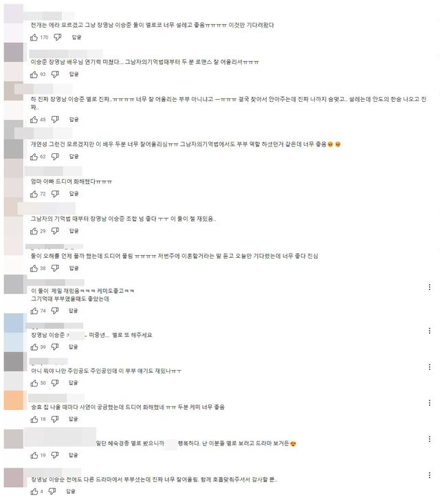 (엑스포츠뉴스 이예진 기자) 배우 장영남, 이승준의 멜로가 큰 사랑을 받고 있다. 과몰입한 시청자들의 반응이 눈길을 끈다.