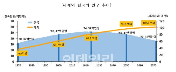 먼저 한국 인구는 올해 5200만명에서 2050년 4700만명, 2072년 3600만명으로 감소세가 이어질 것으로 예측했다. 세계 인구는 올해 81억6000만명, 2050년 96억6000만명, 2072년 102억2000만명으로 지속적으로 증가하는 것과 다른 흐름이다.