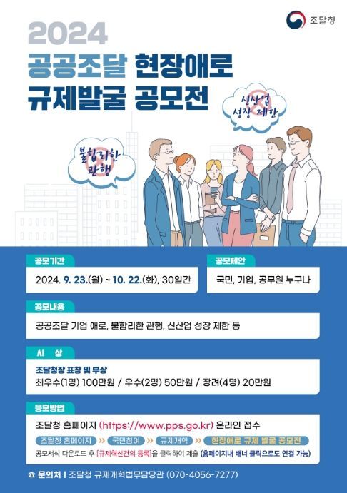[와이뉴스] 조달청은 국민과 기업의 눈높이에서 규제개선 과제를 발굴하고 해소하기 위하여 공공조달 현장규제 공모전을 개최한다고 밝혔다.