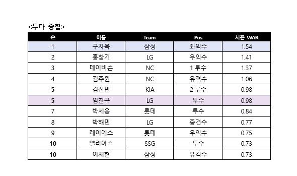 전반기 등판한 14경기에서 평균자책점 4.08을 기록했던 임찬규는 후반기 10경기에선 3.39로 한층 안정감 있는 모습을 보여줬다. 국내 선발 투수 기준으로는 가장 낮은 평균자책점을 기록했다. 임찬규는 QS도 7번이나 해냈다.투수 부문 WAR 2위는 0.84를 기록한 박세웅(롯데)이다. 박세웅은 9월 등판한 4경기에서 평균자책점 2.05를 기록했다.