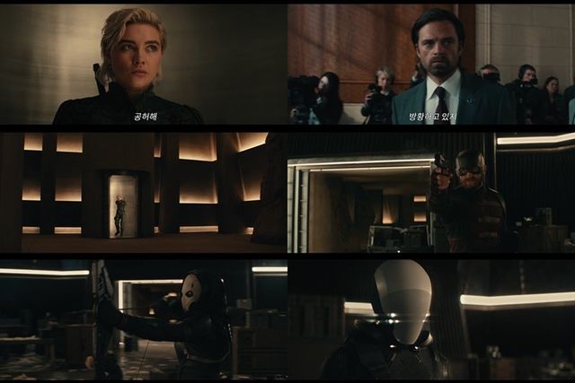 공개된 티저 예고편은 친언니처럼 여겼던 블랙 위도우(스칼렛 요한슨)의 죽음 이후, 공허함을 느끼던 옐레나 벨로바(플로렌스 퓨)가 레드 가디언(데이빗 하버)의 집을 찾아가는 모습으로 시작된다. 삶의 목적성을 잃은 채, 방황하던 그는 새로운 미션을 받고 의문의 실험실에 잠입하게 되고 그곳에서 존 워커(와이어트 러셀)를 비롯해 고스트(해나 존-케이먼), 태스크마스터(올가 쿠릴렌코)를 마주하며 격한 전투를 벌인다.