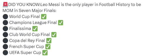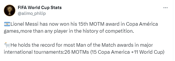 메시는 역사상 7번의 메이저 결승전에서 MOM을 받은 유일한 선수