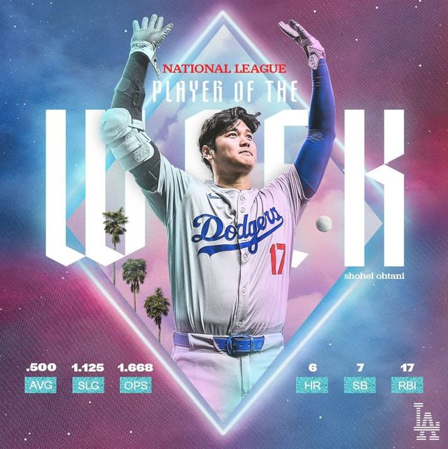 오타니는 지난 17~23일 총 7경기에 출전해 무려 타율 0.500(32타수 16안타) 6홈런 17타점 11득점 7도루 출루율 0.543 장타율 1.125 OPS 1.668이라는 역대급 기록을 세웠다. 이로써 오타니는 타율, 안타, 득점, 홈런, 타점, 도루 장타율, OPS 8개 부문에서 NL 주간 1위를 차지했다.