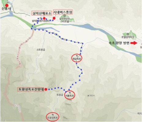 여기서 말하는 폭포가 바로 한국에서 가장 긴 자연폭포인 “토왕성폭포” 상단 150m, 중단 80m, 하단 90m 의 총 길이 320m 에 달하는 거대한 폭포로 이 폭포를 볼 수 있는 전망대는 설악산이 국립공원으로 지정된 1970년부터 통제돼 2015년에야 개방되었다.
