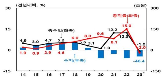 24일 한국은행이 발표한 '2023년 공공부문계정'에 따르면 지난해 공공부문 총수입은 1106조7000억원으로 전년 대비 11.5(10%)조원 감소했다. 총지출은 1153조1000억원으로 전년 대비 23조8000억원(2.0%) 줄었다. 이에 공공부문의 수지는 46조4000억원 적자를 봤다. 전년 대비 적자 폭은 12조3000억원 줄었다.