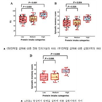 특히 삽화기억 점수는 높은 단백질 섭취 그룹이 43점으로 낮은 단백질 그룹 34점보다 27% 높았다.