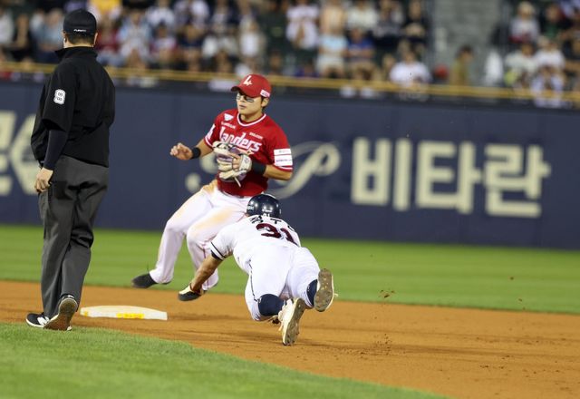 정수빈은 지난해 도루왕(39개)이었다. 2009년 프로 입단 후 첫 타이틀 수상이다. 30대 중반 나이지만 올해는 스퍼트를 더 올리며 첫 40도루를 넘어 50도루까지 달성했다. 내친 김에 24일 NC 다이노스전에서도 뛰어 52호까지 만들었다. 커리어하이지만, 도루왕 수성 가능성은 희박하다. 팀 후배 조수행이 무려 64도루로 선두를 달리고 있다.