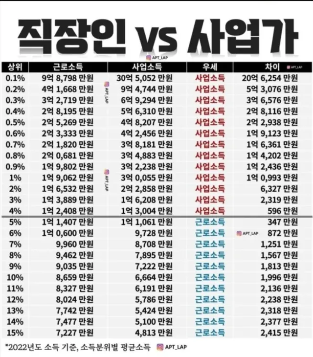 직장인중 1등급은 사업가중 1등급보다 돈을 적게 번다.