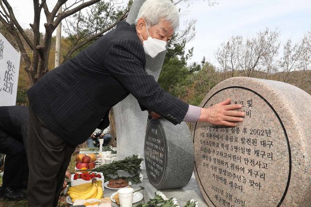2022년 3월 28일 오전 대구 달서구 와룡산 선원공원 개구리소년 추모 및 어린이 안전 기원비 앞에서 열린 '개구리소년 31주기 추모제'에 참석한 유족대표 우종우(우철원 군 아버지)씨가 추모비를 어루만지고 있다. 개구리소년 실종사건은 1991년 3월 26일 대구성서초교에 다니던 우철원(당시 13세), 조호연(12), 김영규(11), 박찬인(10), 김종식(9)군이 도롱뇽 알을 주우러 간다며 집을 나섰다 실종된 뒤 11년 6개월 만인 2002년 9월 성서 와룡산 중턱에서 유골로 발견된 사건이다. / 뉴스1