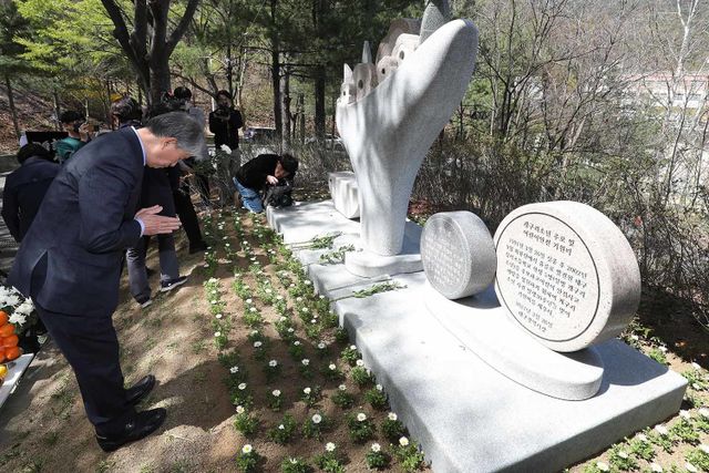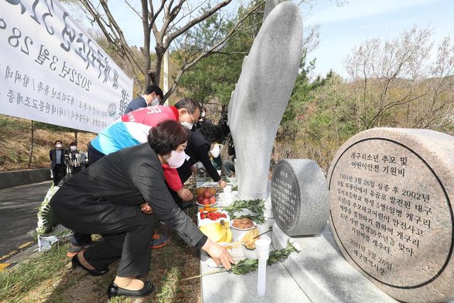 2022년 3월 28일 대구 달서구 와룡산 선원공원 개구리소년 추모 및 어린이 안전 기원비 앞에서 열린 '개구리소년 31주기 추모제'에서 유가족 등 참석자들이 헌화하고 있다. 개구리소년 실종사건은 1991년 3월 26일 대구성서초교에 다니던 우철원(당시 13세), 조호연(12), 김영규(11), 박찬인(10), 김종식(9)군이 도롱뇽 알을 주우러 간다며 집을 나섰다 실종된 뒤 11년 6개월 만인 2002년 9월 성서 와룡산 중턱에서 유골로 발견된 사건이다. / 뉴스1