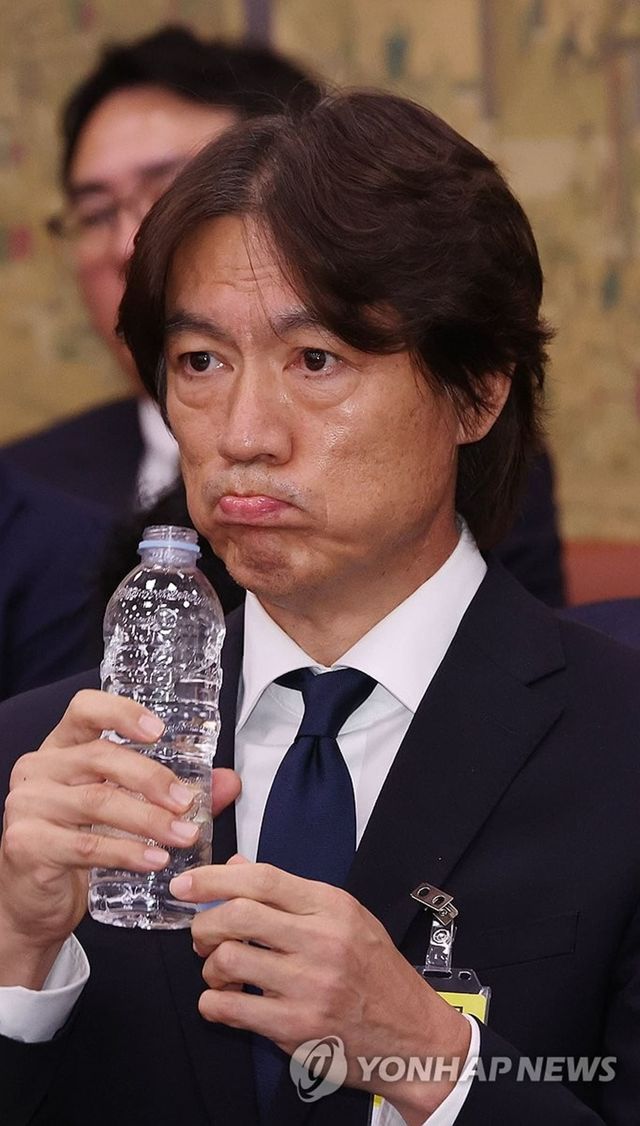 축구 국가대표팀 홍명보 감독이 24일 국회에서 열린 문화체육관광위원회 전체회의에 출석, 물을 마시고 있다. / 연합뉴스
