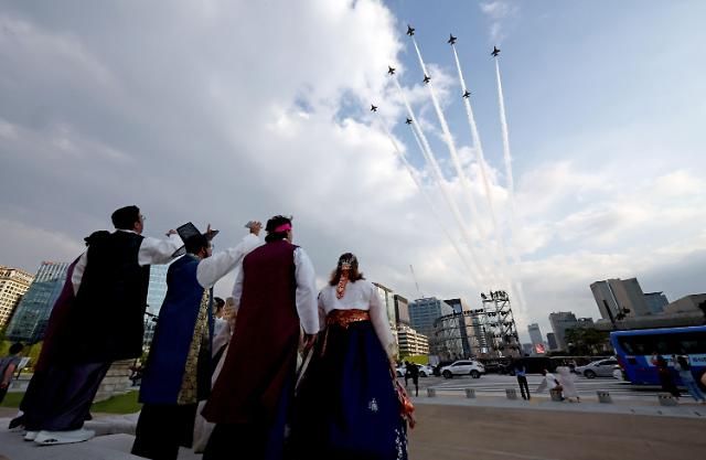 25日,国军日即将到来之际,在首尔光华门上空空军在实行演戏。【图片来源 韩联社】