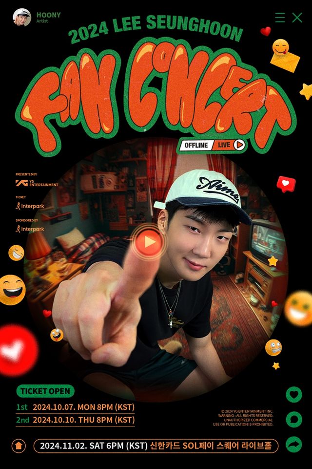 27일 YG엔터테인먼트에 따르면 이승훈은 오는 11월 2일 서울 마포구 서교동 신한카드 SOL페이 스퀘어 라이브홀에서 '2024 LEE SEUNGHOON FAN CONCERT [OFFLINE LIVE]'를 개최한다.