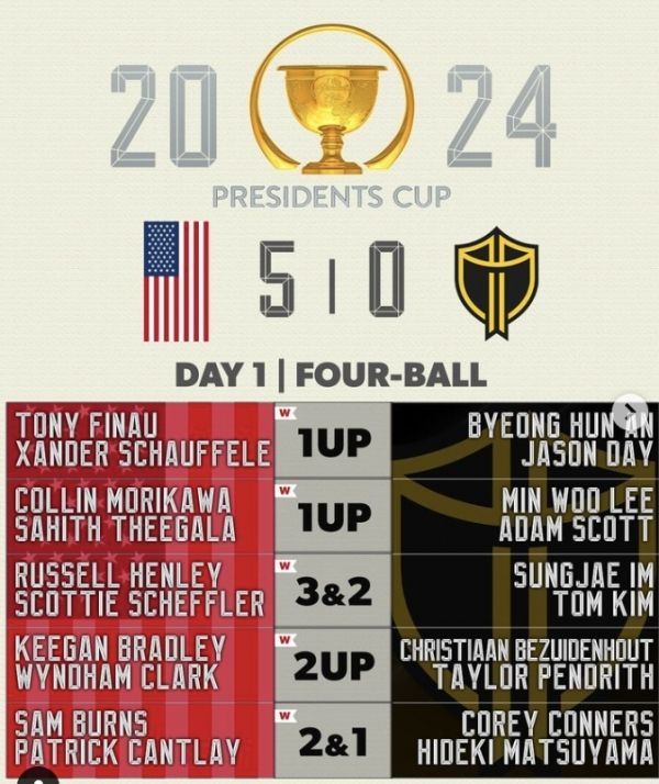 미국 팀은 첫날 포볼 5경기를 모두 승리, 5-0으로 앞서가며 프레지던츠컵 10연속 우승을 향한 청신호를 밝혔다.