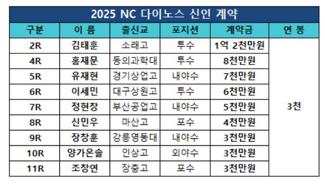 우선 2라운드에서 지명된 투수 김태훈(소래고)이 계약금 1억2000만원에 계약을 마쳤다. 드래프트 당시 임선남 NC 단장은 "중학교 시절 유격수로 출전했고 신장이 커져 고교 진학 후 투수로 전향했다. 건강한 팔, 강력한 구위를 높게 평가했고, 데이터를 분석해도 KBO 기준으로 직구 회전력이 최상급이었다. 대부분의 삼진을 포심으로 기록한 점을 인상적으로 평가했다. 공의 수직 움직임도 굉장히 우수해 지명했다"고 기대감을 나타냈다.