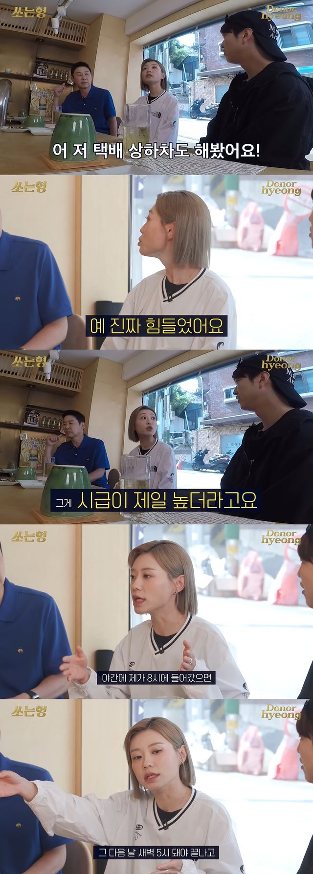 그러자 김예지는 "저 택배 상하차도 해봤다. 진짜 힘들었다. 근데 그게 시급이 제일 높더라. 시간 타임으로 하는데 야간에 제가 8시에 들어갔으면 그 다음 날 새벽 5시 돼야 끝나고"라며 택배 상하차 일화를 털어놓기 시작했다.