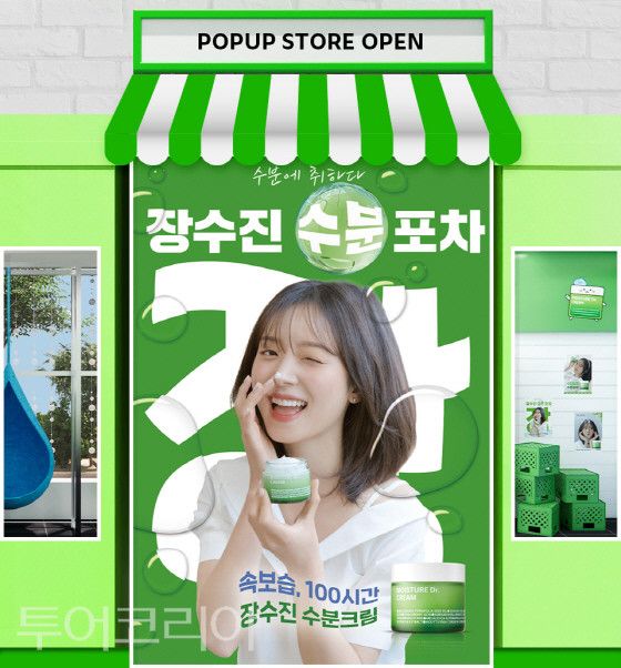 이번 팝업에서 수분 케어 라인 베스트셀러 제품인 장수진 수분크림의 특장점을 ‘수분포차’라는 컨셉에 색다르게 담아냈다. 장수진 수분포차는 제품의 키컬러인 ‘그린’을 활용한 공간은 포스터, 캠핑 박스, 드럼통 등 포차 감성을 살린 소품들로 채워졌다.