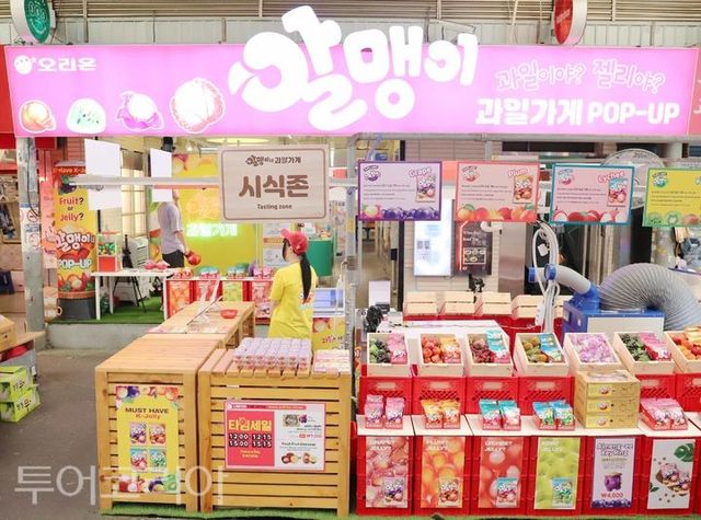 오리온은 광장시장에서 ‘알맹이’ 젤리 팝업스토어 ‘알맹이네 과일가게’를 운영한다.
