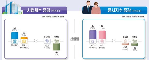 제조업 사업체가 줄어들며 제조업에 종사하는 이들의 수도 1년 전과 비교해 0.9%(3만8000명) 감소했다. 건설업 종사자 수도 1.8%(3만5000명) 감소했다. 통계청 관계자는 “부동산 경기가 침체된 상태에서 아파트는 물론 단독주택 등도 신규 착공이 줄어든 영향”이라고 분석했다.