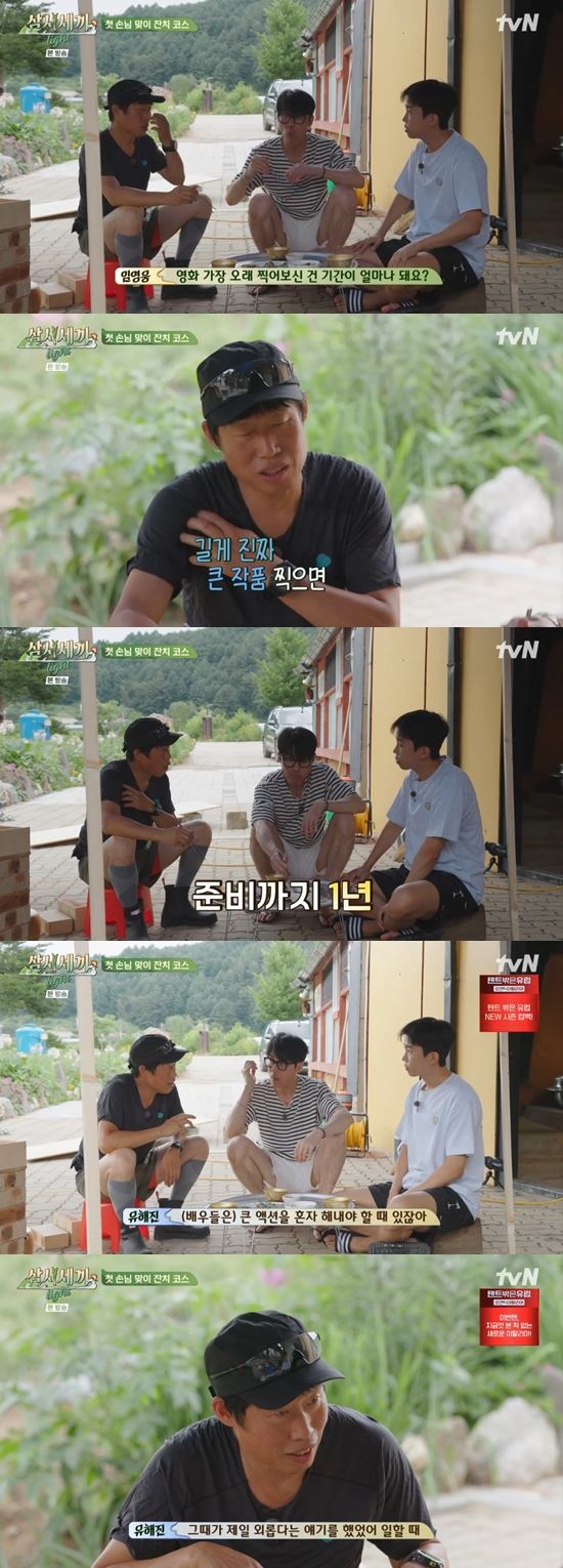 임영웅은 "영화 가장 찍어 보신 건 기간이 어떻게 되냐"고 궁금해했다. 유해진은 "길게 큰 작품 찍으면 준비까지 1년 정도 걸린다. 보통이 네 달"이라고 대답했다.