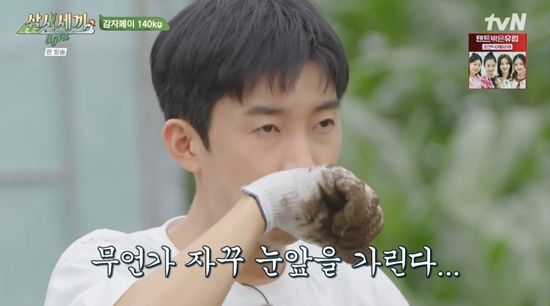 점심을 먹고 난 뒤 설거지를 마친 임영웅은 140kg 감자 캐기에 합류했다.