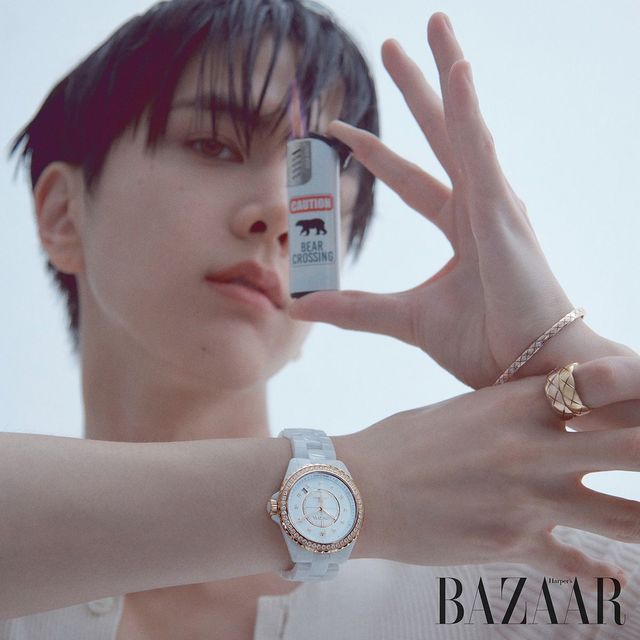 다이아몬드 장식의 18K 베이지 골드 미니 브레이슬릿, 검지에 착용한 18K 베이지 골드 스몰 링, 18K 옐로 골드 스몰 링은 모두 ‘코코 크러쉬’ 컬렉션 Chanel Fine Jewelry. ‘J12 다이아몬드 베젤 칼리버 12.1 38MM’ 워치는 Chanel Watches.