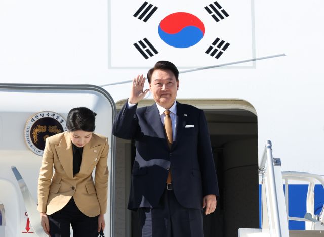 ▲체코 공식 방문 일정을 마친 윤석열 대통령과 부인 김건희 여사가 21일(현지시간) 프라하 바츨라프 하벨 국제공항에서 전용기인 공군 1호기에 올라 인사하고 있다. ⓒ연합뉴스