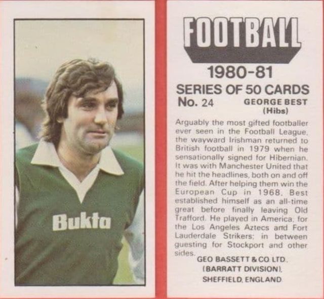 아일랜드 이민자들이 설립한 하이버니안은 전통적으로 그린과 화이트 칼라의 셔츠를 착용했고 이는 나중에 스코틀랜드 축구 명문 셀틱의 셔츠 칼라에 영향을 준다. 사진은 맨체스터 유나이티드 출신의 전설적인 축구선수 조지 베스트가 힙스 시절 클럽의 벅타 셔츠를 입고 있는 모습. 사진=풋볼 카드 캡처