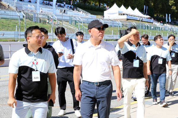 정의선 현대차그룹 회장(가운데)이 29일 경기도 용인 에버랜드 스피드웨이(길이 4.346km)에서 열린 2024 현대 N 페스티벌 제4전을 찾아 피트를 둘러보고 있다.