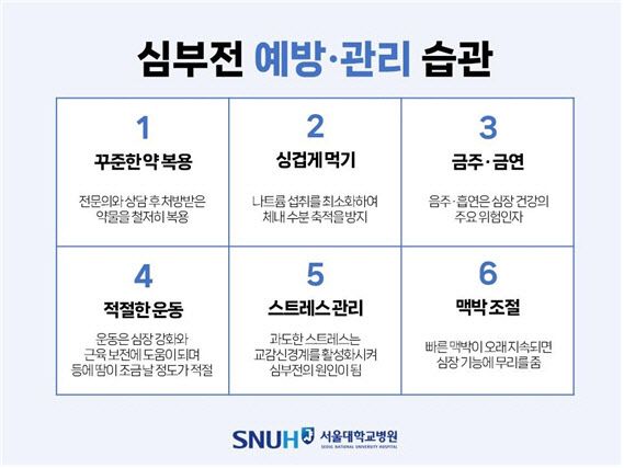 이해영 교수는 “심부전 환자의 10%가 1년 내 잘못될 수 있지만, 반대로 90%는 적절한 치료와 관리를 통해 건강을 유지할 수 있다. 약을 잘 복용하고, 하루 염분 섭취량을 철저히 조절하며, 꾸준한 운동으로 심장을 단련하면 건강한 심장을 갖고 살아갈 수 있다. 또한 가족들도 환자를 위해 덜 짜게 먹는 식습관을 유지하고, 규칙적으로 움직이도록 도와준다면 심부전 치료에 많은 도움이 된다”고 조언했다.