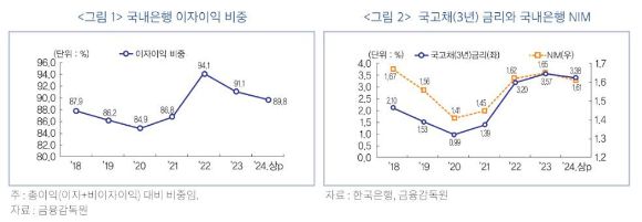 이 연구위원은 "은행의 순이자수익(NIM)은 우리나라 기준금리 인하에 따라 시장금리가 하락하면, 하방 압력을 받을 것"이라고 말했다. NIM은 예대마진을 나타내는 은행의 핵심 수익 지표로, 보통 금리가 낮아지면 줄어든다. 올해 상반기 국내 은행의 총이익(이자+비이자) 중 이자 이익 비중은 89.8%에 달한다.