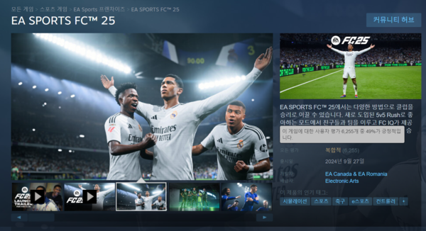 다만, 게임의 최근 인기와는 달리 이용자들의 평가는 크게 호불호가 나뉘는 반응이 나타나고 있다. 29일 ‘EA 스포츠 FC 25’의 스팀 이용자 평가는 6,255개 평가 가운데 49%만이 게임을 호평한 ‘복합적’에 머물러 있다.