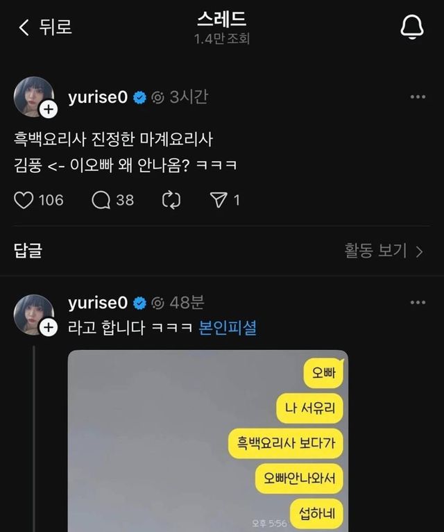 최근 서유리는 개인 스레드에 “흑백요리사 진정한 마계요리사 김풍, 이 오빠 왜 안 나옴? ㅋㅋㅋ”이라는 글을 올린 뒤 실제 김풍과 주고받은 카톡 내용을 공유했다.
