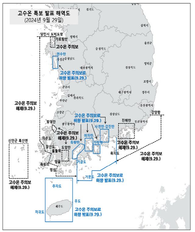 국립수산과학원은 폭염 발생 가능성이 낮고 수온이 점차 낮아짐에 따라 12개 해역에 내려진 고수온 경보를 주의보로 하향 조정하고, 18개 해역에 내려진 주의보는 해제했다.
