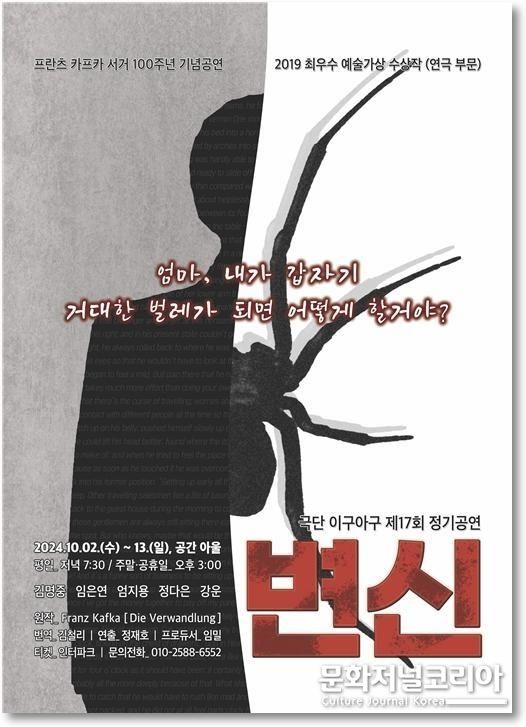 문화저널코리아 김영일 기자 | ‘극단 이구아구(대표 정재호)’가 제17회 정기공연으로 2024년 10월 2일(수요일)부터 13일(일요일)까지 서울 종로구 대학로에 위치한 소극장 ‘공간 아울’에서 ‘연극 [변신]’을 공연한다.