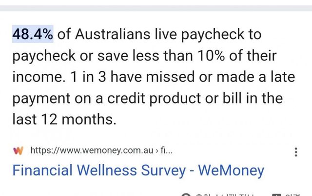호주 인구 48.4% 가 저축을 못하거나 월급의 10% 미만으로 저축함. 그리고 호주 인구 3분의1이 신용카드 지불 연체.