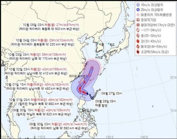 (서울=포커스데일리) 문성준 기자 = 지난 28일 필리핀 마닐라 부근 해상에서 발생한 18호 태풍 '끄라톤'이 30일 대만 남쪽 해역을 통과해 10월로 접어들며 대만 해상 부근에서 북상할 것으로 예상된다.