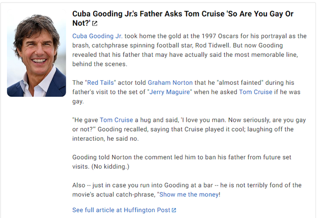 아버지가 톰 크루즈를 안아주고 "오 톰 사랑해. 근데 진지하게 궁금한데 너 게이야 아니야?" 라고 물었어요
