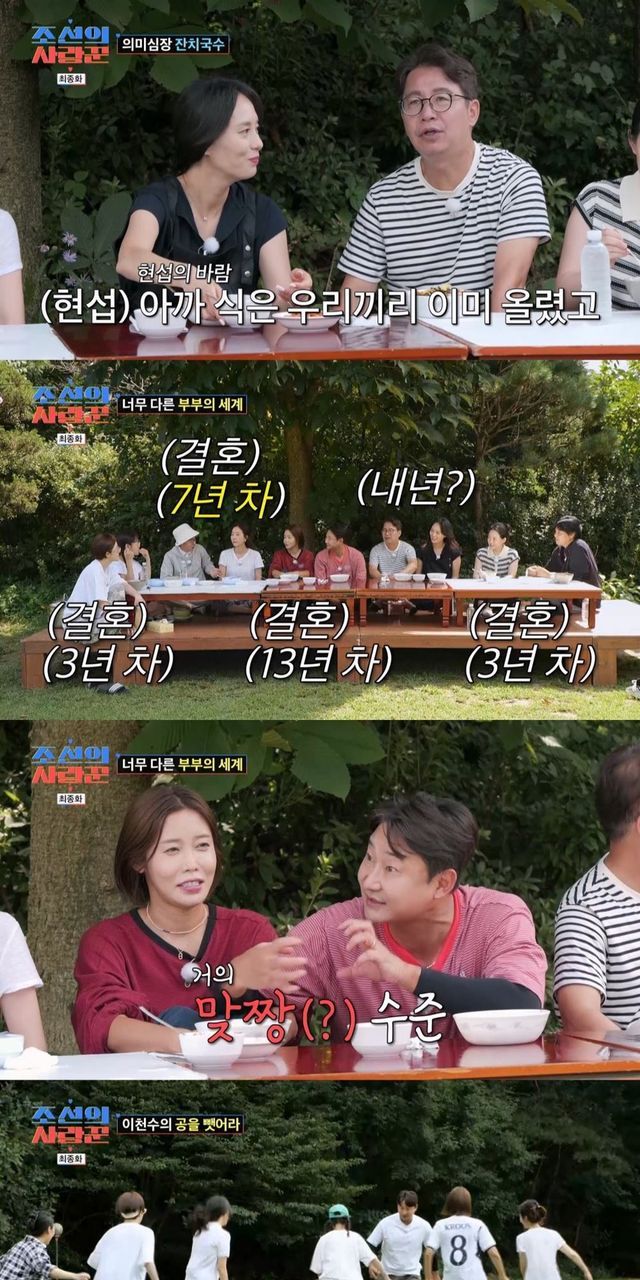 지난 9월 30일(월) ‘조선의 사랑꾼’에서는 수많은 사랑을 지켜보고, 저마다의 사랑을 가꾼 ‘사랑꾼즈’가 대대적인 첫 야유회를 가졌다. ‘몰래 온 손님’으로 야유회 장소에 먼저 도착한 심현섭 커플은 잔치국수를 준비하며 ‘사랑꾼즈’를 환영했다. 메뉴를 본 황보라는 “오늘 뭐…결혼 발표하시는 거냐”며 돌발 질문을 건넸다. 심현섭은 “아까 결혼식은 둘이 끝냈고, 여기 야외 결혼식장이잖아요. 지금 식사하는 거다”라는 농담으로 받아쳤다. 이에 김국진은 “현섭이가 말하면 못 믿겠다”며 의심의 눈길을 보냈고, 강수지도 “결혼을 하는 건 맞죠?”라며 폭풍 질문을 건넸다.