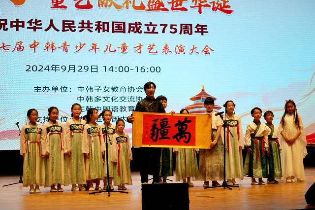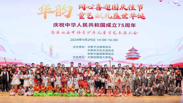 9月29日,由中韩子女教育协会、中韩多文化交流协会、在韩中国语教育协会联合主办的“同心喜迎国庆佳节•童艺献礼盛世华诞”庆祝中华人民共和国成立75周年暨第七届中韩青少年儿童才艺表演大会在仁川隆重举行。本次大会得到了中国驻韩国大使馆及多家在韩机构的大力支持,当天在韩华侨华人子女700余人来到了演出现场,大家欢聚一堂、共庆佳节。
