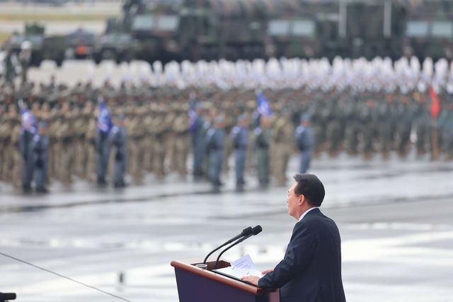 윤석열 대통령이 1일 경기도 성남 서울공항에서 열린 건군 제76주년 국군의 날 기념식에서 기념사를 하고 있다. / 뉴스1