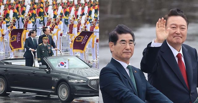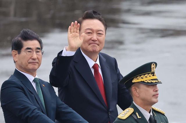 윤석열 대통령이 1일 경기도 성남 서울공항에서 열린 건군 제76주년 국군의 날 기념식에서 김용현 국방장관과 함께 사열하며 손인사를 하고 있다. / 뉴스1