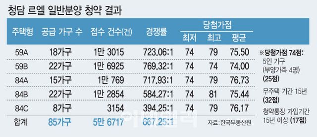 1일 한국부동산원 청약홈에 따르면 청담 르엘 모든 주택형의 최소 당첨 가점이 74점을 기록했다. 이는 5인 가구가 15년 이상 무주택을 유지해야 나올 수 있는 점수다.