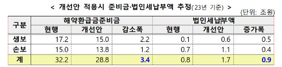 금융위는 개선안 적용 시 2023년 기준 해약환급금 준비금은 32조2000억원에서 28조8000억원으로 3조4000억원 감소할 것으로 예상했다. 줄어든 3조4000억원만큼 배당 가능 이익이 생긴다. 법인세 납부액도 8000억원에서 1조7000억원으로 9000억원 증가한다.