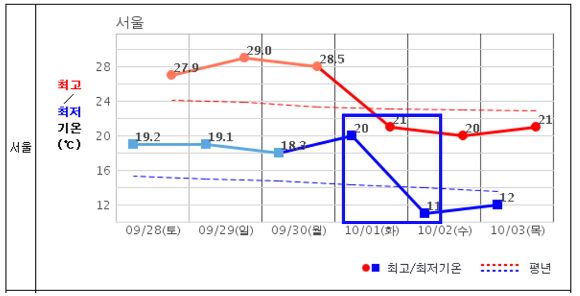 [아이뉴스24 정종오 기자] 2일 서울의 아침 최저기온은 11도로 전국적으로 기온이 뚝 떨어질 곳으로 보인다. 2~4일에는 우리나라 남동쪽을 중심으로 비가 내리겠다. 제18호 태풍 ‘끄라톤’이 우리나라에 영향을 미치면 더 많은 비가 올 것으로 내다봤다. 2일에는 기온이 큰 폭으로 떨어지겠다. 건강에 주의해야 한다고 기상청은 당부했다.