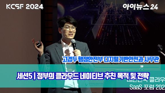 [아이뉴스24 정소희 기자] ICT 중심 종합경제미디어 아이뉴스24가 주최한 '대한민국 클라우드/SaaS 포럼 2024(KCSF2024)'이 26일 서울 영등포구 여의도동 FKI타워 그랜드볼룸에서 열렸다. 고경두 행정안전부 디지털기반안전과 사무관이 '정부의 클라우드 네이티브 추진 목적 및 전략'을 주제로 강연하고 있다.