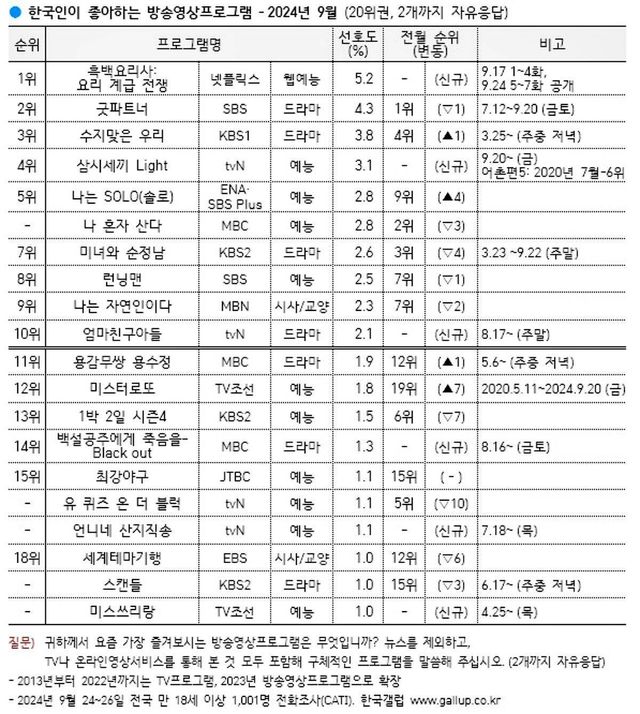 '한국인이 좋아하는 방송 영상 프로그램' 2024년 9월 20위권 전체 순위표 / 한국갤럽 제공