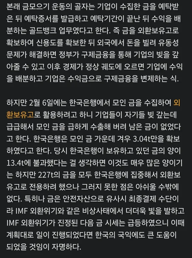 원래목적은 금을 외환보유고로 넣어서 신용회복 하는거였는데 227톤중 3.4톤을 제외하고는 기업들이 빚 갚는다고 팔아버림(갑자기 금이 많이 풀려서 시세는 떨어짐)